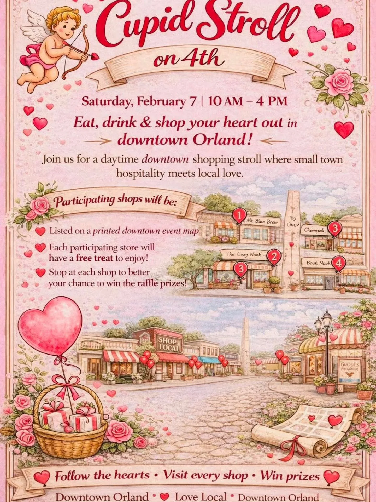 Stroll through downtown Orland at your own pace, pop into your favorite shops, discover something new, and enjoy a festive Valentine-inspired atmosphere full of smiles, treats, and community connection.