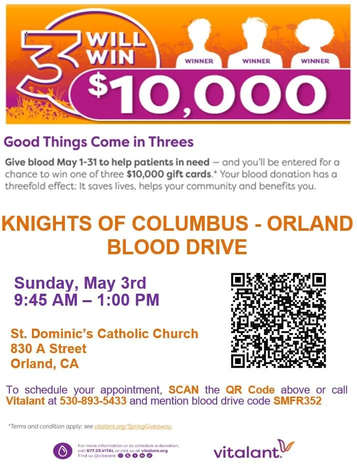Knights of Columbus Orland Blood Drive Sunday, May 3, 2026 9:45 AM 1:00 PM St. Dominic's Catholic Church 830 A Street Orland, CA, 95963 United States (map) Google Calendar ICS