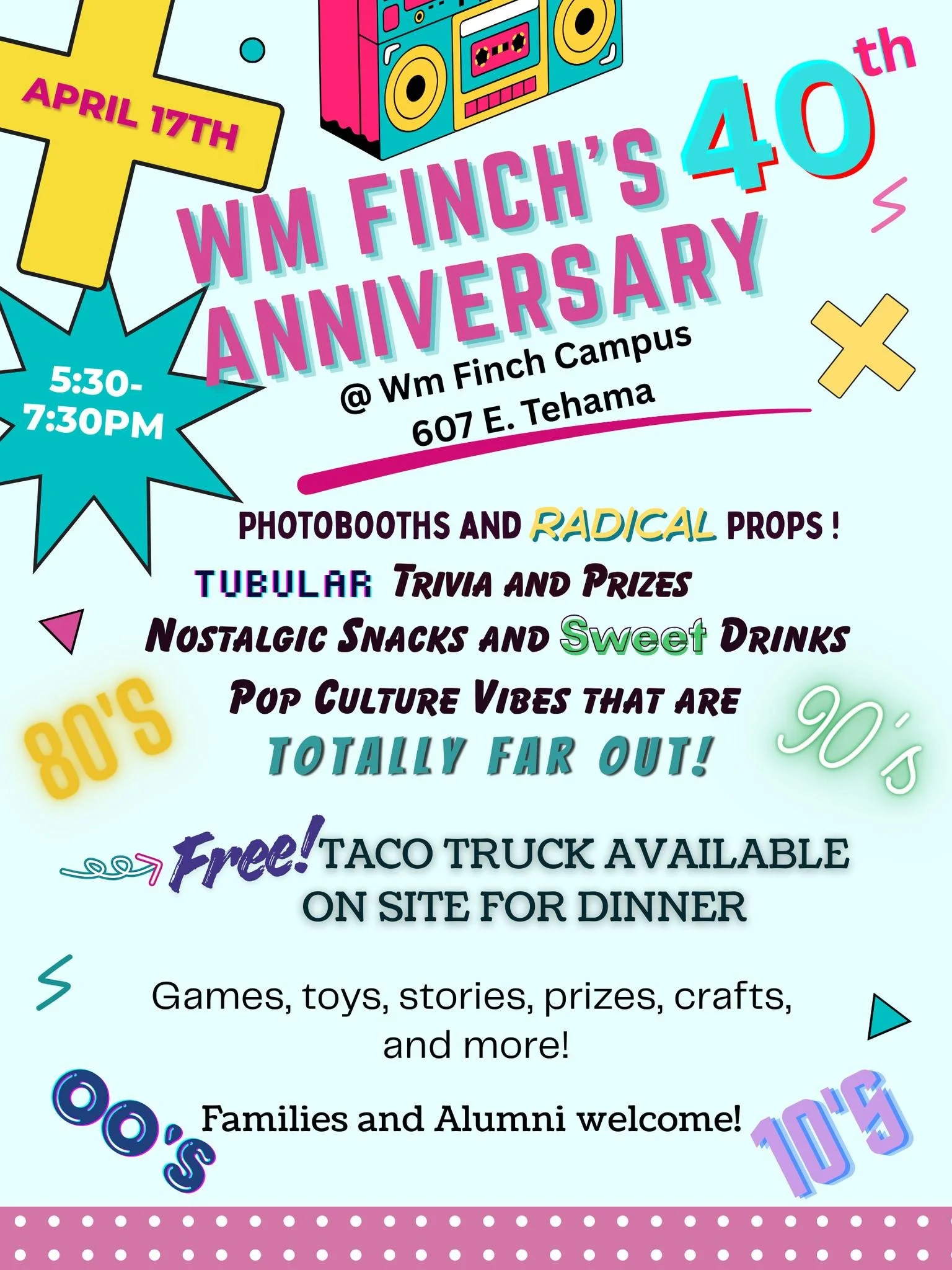Back to All Events WM Finch’s 40th Anniversary Friday, April 17, 2026 5:30 PM 7:30 PM WM Finch 607 East Tehama Street Orland, CA, 95963 United States (map) Google Calendar ICS